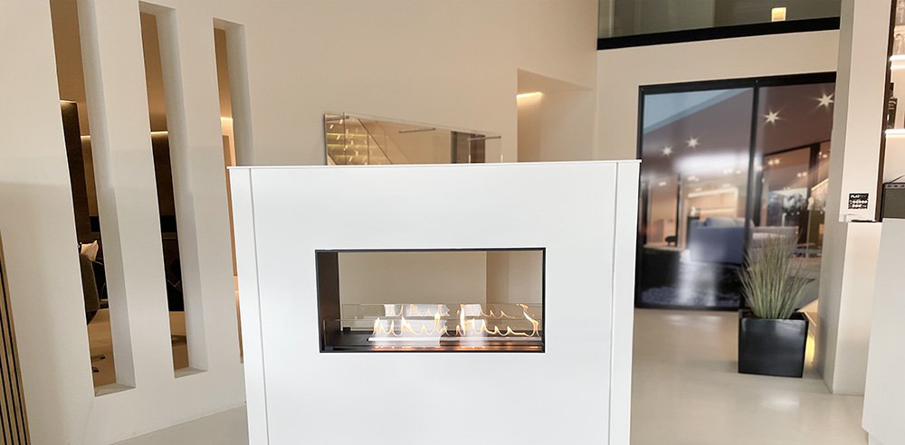 Choose from a variety of burners, finishes, and glass colours to perfectly match your style. The panel wall comes equipped with hidden wheels, allowing you to easily move it aside when hosting larger gatherings.