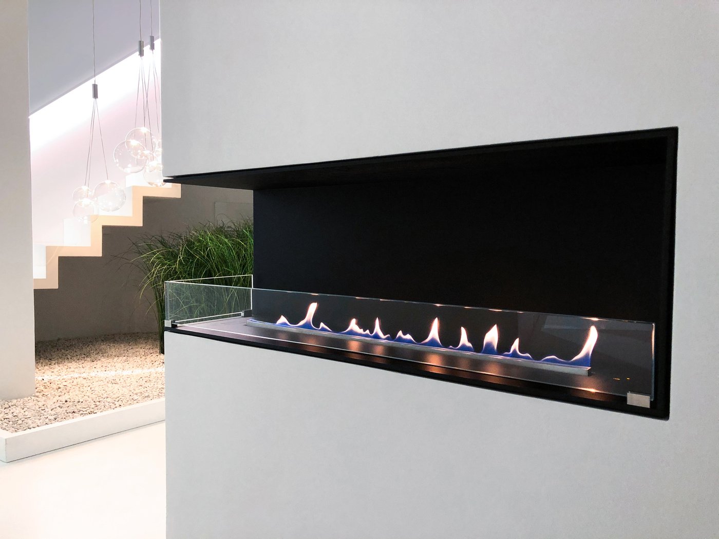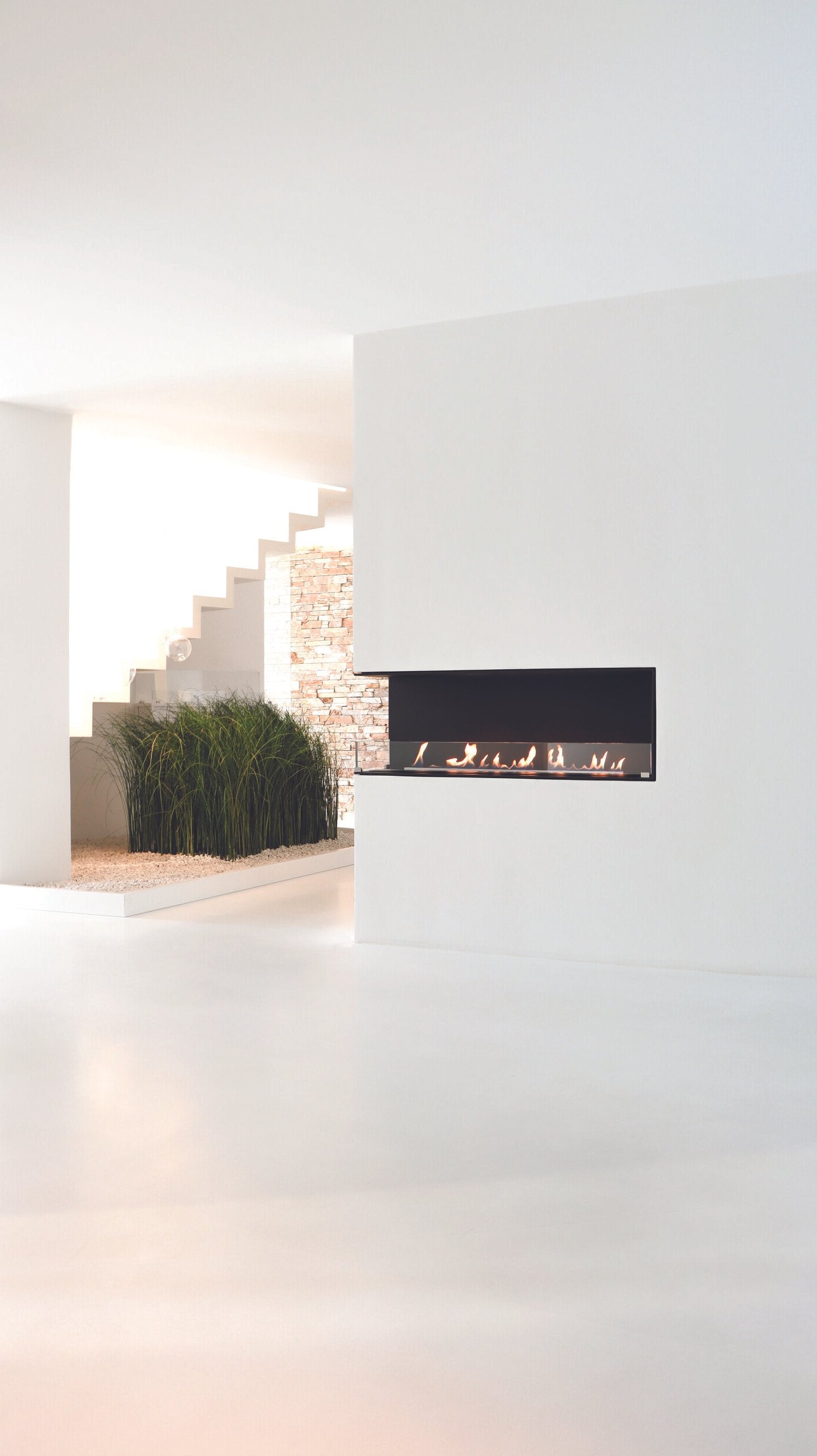 This stylish and intriguing built-in fireplace is visible from the front and one side, making it a focal point in any room. It can be fitted with either a bioethanol burner or a Hybrid Mist burner.