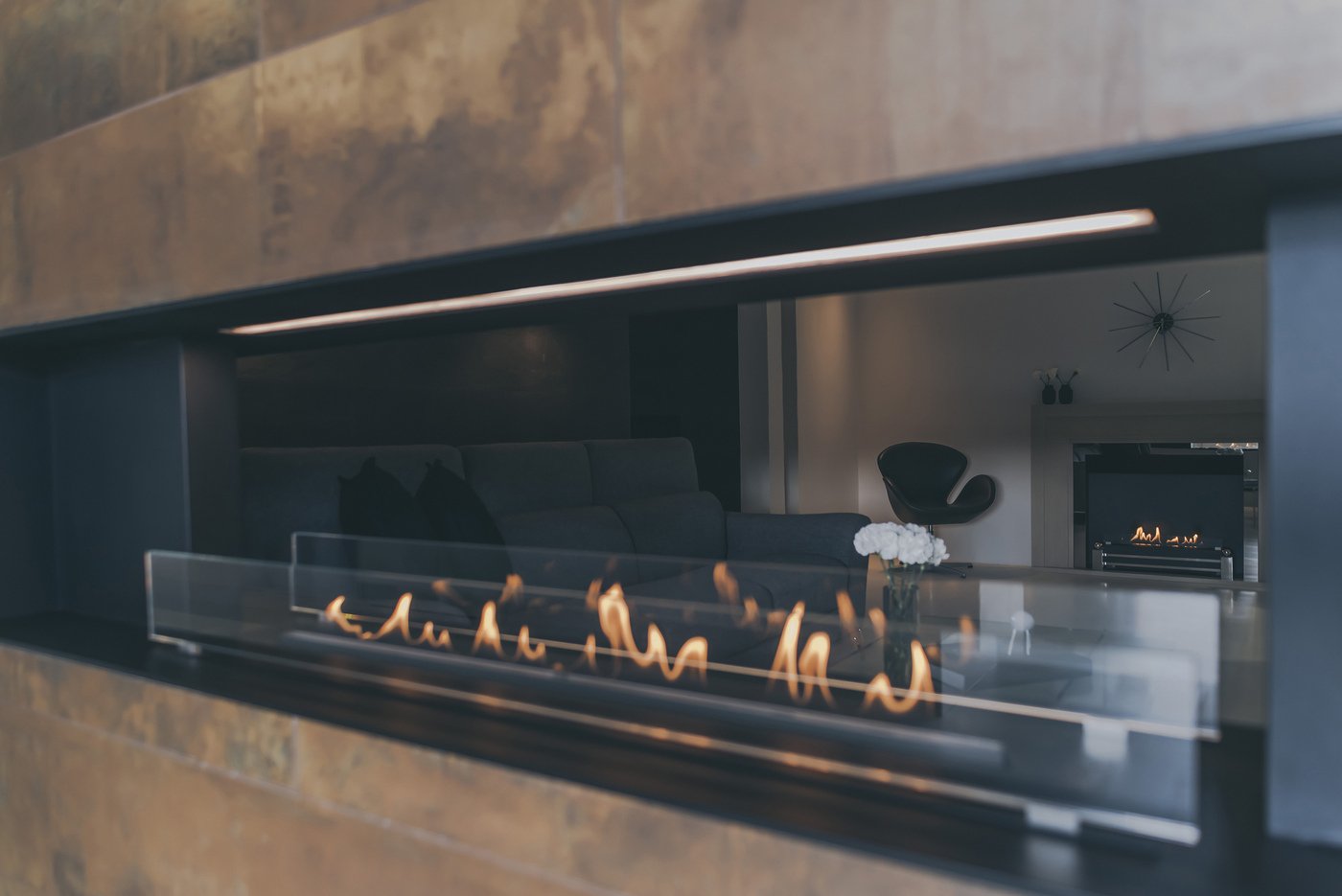 This stunning biofireplace offers a beautiful view between two rooms, spreading warmth and cosiness on both sides.