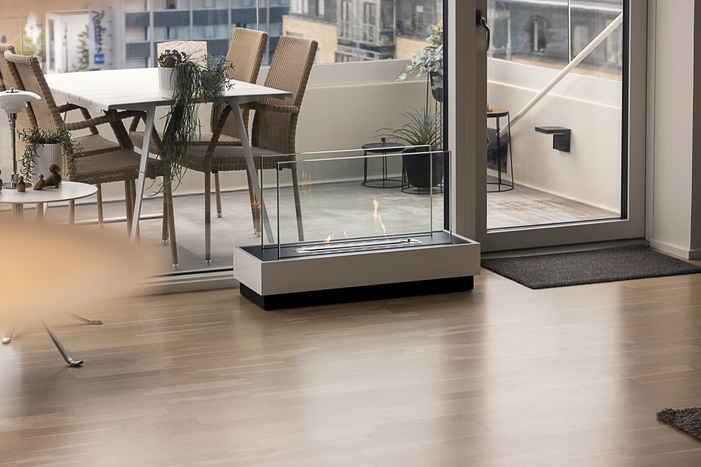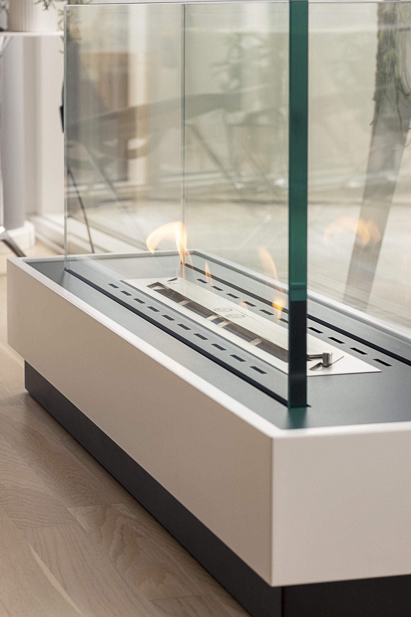 World Plaza is a stunning floor-standing biofireplace from Danish Decoflame, featuring a sleek and sophisticated design crafted from high-quality materials. This model is equipped with hidden wheels, allowing easy mobility around the home (when turned off).